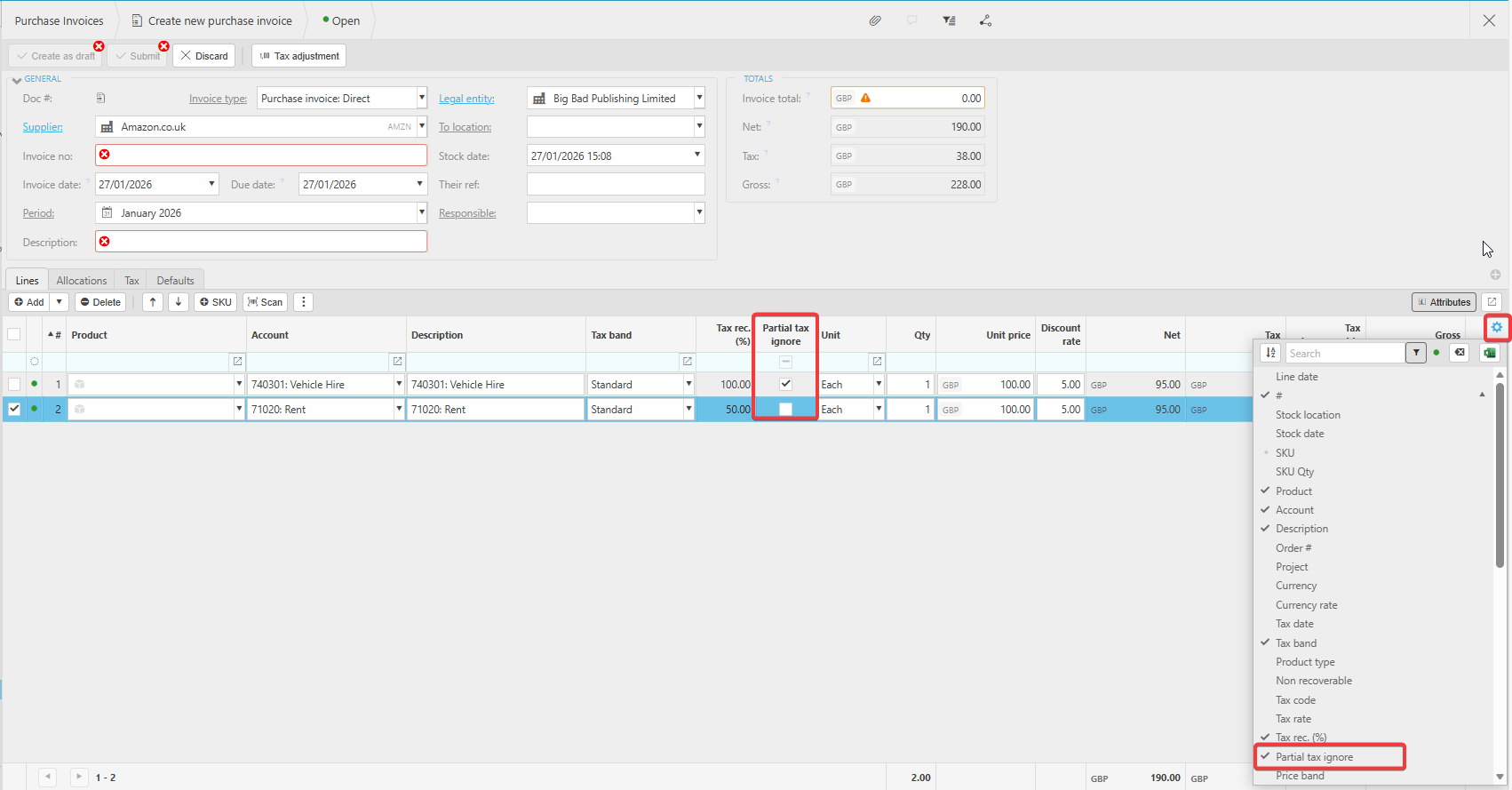 - Tick the Partial Tax Ignore box on all other lines so they use normal VAT rules.